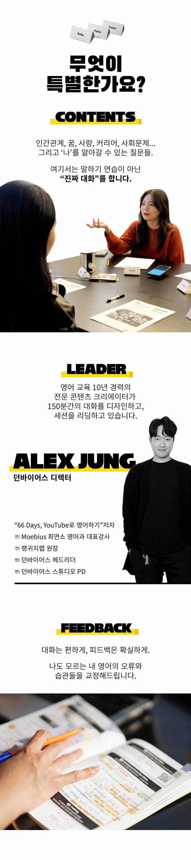 세션은 150분동안 진행됩니다. 세션이 시작하면 100% 영어로만 소통합니다. 1부와 2부를 나누어 진행되며, 1부는 코칭과 게임 위주의 액티비티가, 2부에선 호흡이 긴 토크와 디베이트가 주로 진행됩니다. 토크세션이 끝나면 리더가 그날 각 멤버들의 영어에 대해 1:1로 피드백을 해주는 시간이 이어집니다. 시즌에 따라 매 주 세션의 컨텐츠가 달라집니다 :)