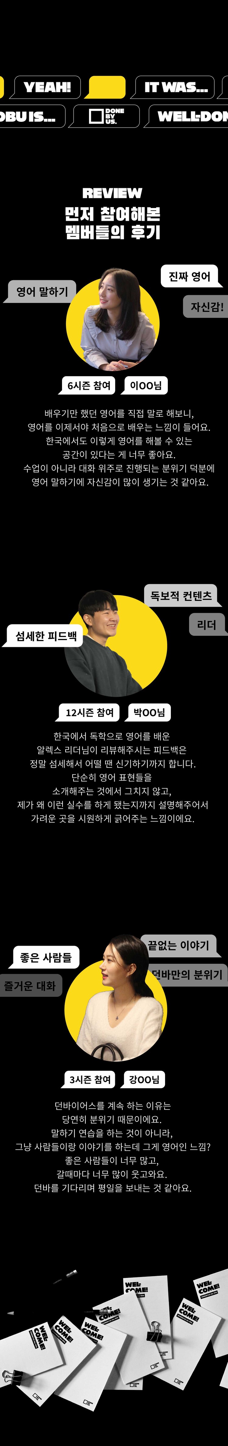 던바이어스 멤버의 91% 멤버들이 혼자 참여하고 계십니다! 경험 많은 리더가 진행을 맡아주기 때문에 처음 본 멤버님들과도 금방 친해지실 거라고 장담해요! :)